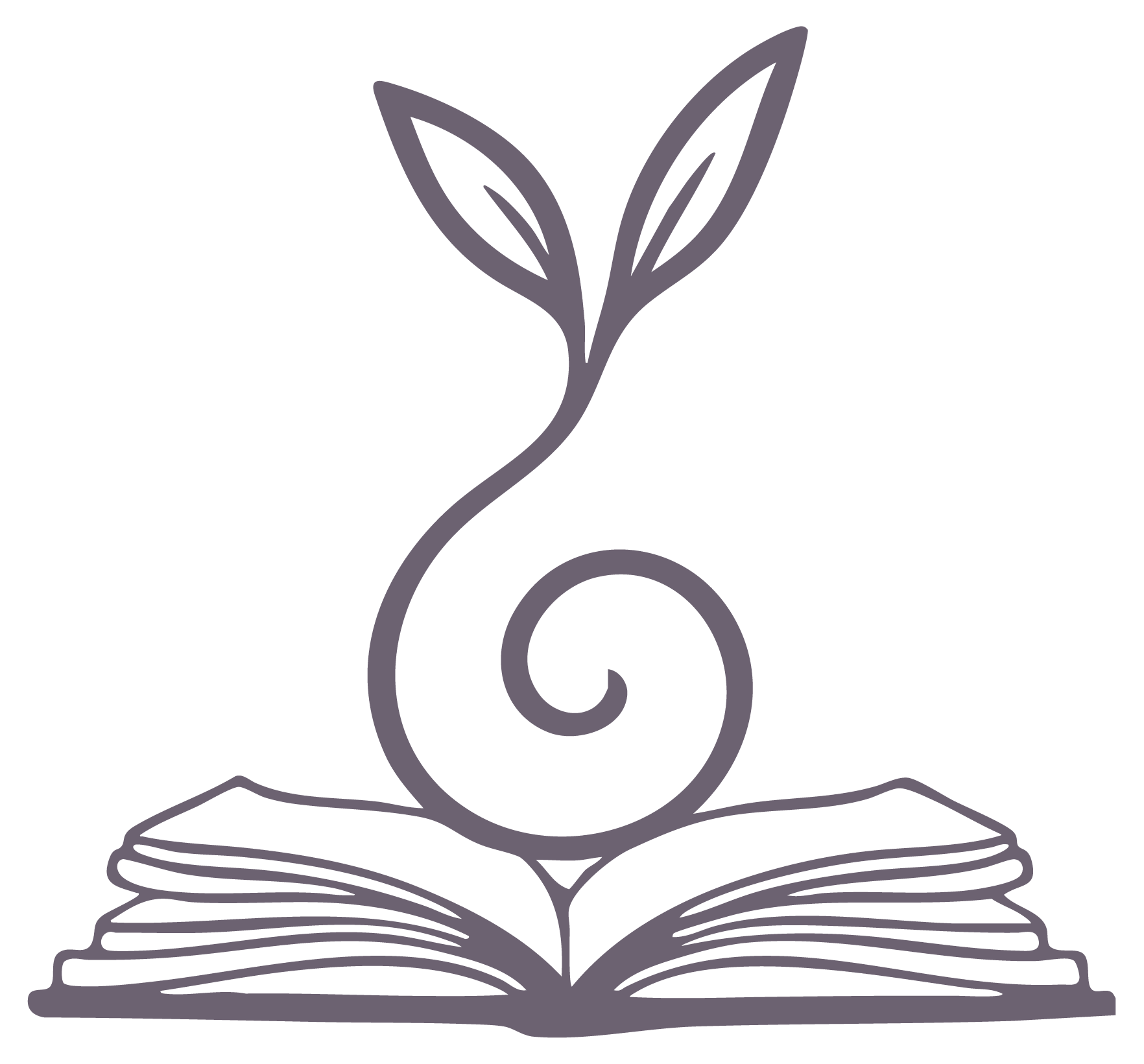 A simple line drawing of a plant sprouting from an open book, symbolizing growth and knowledge.